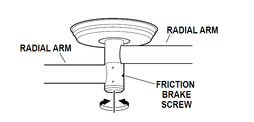 Horizontal drift in the radial arm can be caused by a friction brake that is loose. First before performing any adjustment check to ensure the mounting plate is level. To adjust the friction brake in the radial arm locate the friction brake screw on the hub end of the radial arm. Adjust the friction brake clockwise to increase the tension of brake. Adjust to the desired tension.